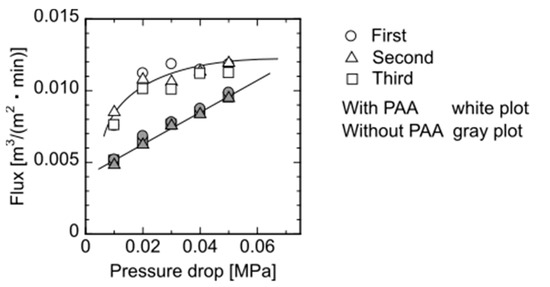 Flux changes at different pressures through the elastic flat-sheet membrane prepared with and without adding PAA is shown in Figure 4. The experiments were performed three times to check the reproducibility. The membrane without PAA showed the linear increment of flux with increasing applied pressure, whereas the membrane with PAA had the non-linear increase, demonstrating that the flat-sheet membrane would exhibit the deformation of the membrane because of the pressure. Figure 4 shows that the membrane with PAA represented the higher flux, demonstrating that the macromolecules such as PAA have the higher exclusion volume to form the large pore in the membrane. After the washing, a part of PAA would be leaked from the membrane. The repeated permeation of water to the membrane was performed, as Figure 4 shows, demonstrating that the flux obtained has reproducible data. Thus, the membrane had a reversible deformation against the applied hydrodynamic pressure.
