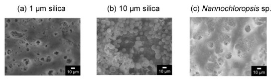 The surface of the membrane after the filtration was observed by SEM, as shown in Figure 6. The image of 10 μm of silica showed the filtered particles on the membrane surface. An amount of 1 μm of silica would be filtered on the membrane, and a part of the silica filtered in the membrane as a depth filtration. Figure 6c shows that some of the filtered Nannochloropsis sp. was observed on the membrane.