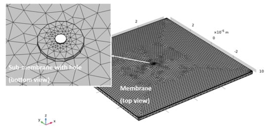 Model mesh of a 50 μm side membrane with a thickness of 1.7 μm, having a sub-membrane at its center, with radius of 2 μm and thickness of 200 nm, and an orifice diameter of 500 nm.
