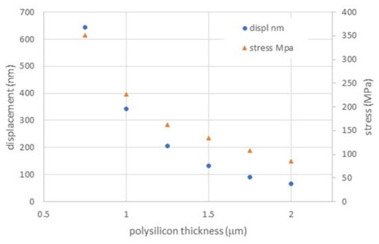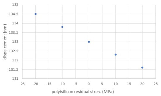 Given the different residual stress values reported in the literature for annealed polysilicon [,], the effect of possible stress fluctuations in the polysilicon layer was assessed by finite element simulation. Results are reported in Figure 5.