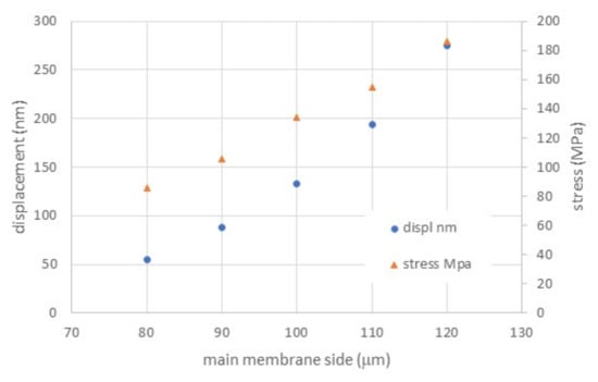 Considering a possible uncertainty in TMAH etching in the dimensional control for such a small membrane size, the stress and displacement as a function of membrane side variation were also simulated, with results as reported in Figure 6.