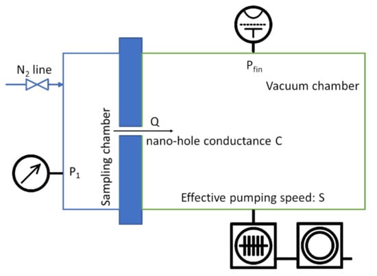 Schematic of the experimental setup. The sampling chamber (left) with a nitrogen inlet is connected to the vacuum chamber by the nanoscopic holes having a conductance C.