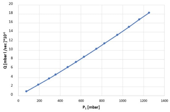 The chips were mounted in the above-described measurement setup, and flows were measured with nitrogen gas under high-vacuum conditions. In Figure 10, the flow measurement of a chip is reported as an example. The collected data of all measured chips were linear in the measured pressure range, with a fit having a square of correlation coefficient of 0.999.
