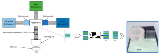Schematic representation of coextrusion process (left); picture of a typical polyethylene (PE)/PEgMA/PA6 multilayer film using 8 LME (right).