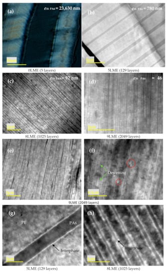As stated above, the thicknesses of micro- and nanolayers are close to the theoretical values calculated from flow rates (see Supplementary Information, Table S2). We note that there is a slight layer thickness distribution, which may be explained by the viscosity differences between phases (Table S2). Nevertheless, all PE (i.e., merged PE and PEgMA) and PA6 layers are continuous for films up to 9 LME, with layer thicknesses down to 46 nm (Figure 2a–d). Layer breakup appears only for the thinnest layers [], i.e., eth PA6 = 46 nm (9 LME film), with an amount of broken layers below 20% (Figure 2e,f).