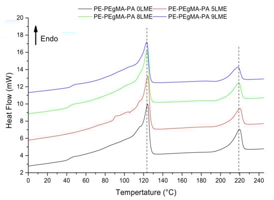 Figure 3 presents the DSC scans for PE/PEgMA/PA6 multilayer films made with different LME number N (0, 5, 8 and 9). Similar thermograms are obtained for all the films, on which several thermal events are observable. The first endothermic peak is due to the melting of PEgMA and PE, while the second peak at higher temperature is attributed to the melting of PA6. The melting temperature Tm = 219 °C suggests the presence of γ-phase only []. For all systems, the crystallinity ratio Xc is close to 39% for PE-PEgMA (PE) and 28% for PA6 (Table 1). It is worth pointing out that conventional DSC scans are slightly perturbed by secondary melting/crystallization and water evaporation phenomena for PA6, as highlighted by TM-DSC (Supplementary Information, Figure S1).