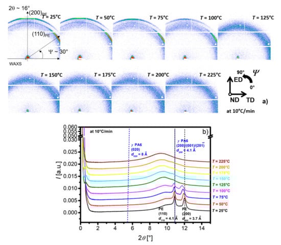 The crystalline structures of both semi-crystalline polymers have been reported for about fifty years [,,]. They are summarized in Supporting Information (Table S3) and show many diffraction peaks superimposed for both PE and PA6 phases. In-situ WAXS experiments during a ramp at 10 °C/min enable to observe PA6, switching off PE phase, due to the well separated PE and PA6 melting temperatures.