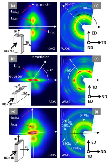 The very intense linear scattering observed along the equator in ND direction, Figure 5c,e, does not concern the structure or the morphology of the polymers, since it is due to film stacking or interface diffusions. All the SAXS and WAXS patterns are anisotropic. The orientation on SAXS images related to the periodic stacking of the crystalline lamellae is compared to the orientation of the cells axis (Figure 5a–c) in the crystalline lamellae observed on WAXS images. The chain directions of PE and PA6 are c- and b-axis, respectively.