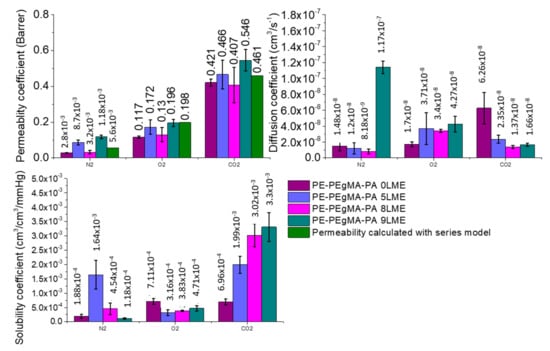 The gas and water permeability coefficients of PE/PEgMA/PA6 multilayer films extruded with 0, 5, 8 and 9 LME were then determined (Figure 6).