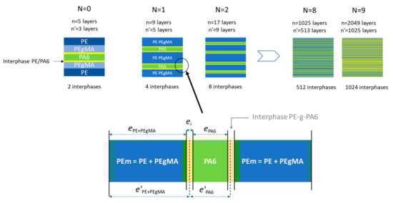 In this work, 0, 5, 8 and 9 LME were used, leading to PE/PEgMA/PA6 multilayers consisting in 5, 129, 1025 and 2049 layers, respectively.