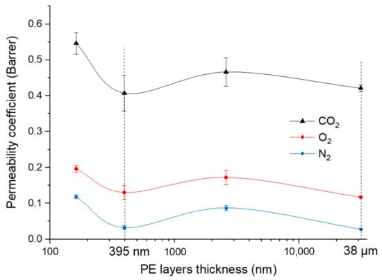 If we plot the gas permeability as function of the PE layer thickness, it is interesting to see similar curves for the three gases. In order to show the possibility of thickness variations in the films we calculate the permeability coefficient for the maximum deviation of average measured thickness and report this impact on our measurements. Taking into account the measurement errors, a tendency appears for the three curves showing a minimum of permeability (Figure 8) obtained for 8 LME and for 0 LME films, in which the theoretical PE nominal layer thickness is ~300 nm (395 nm measured) and ~38 µm (32 µm measured), respectively.