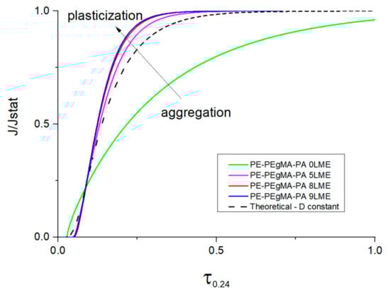 For water, the values of permeability coefficients are quite similar for all multilayer films that is to say that no enhanced barrier effect was obtained towards water molecules contrary to gas molecules. The case of water permeation is more complex than gases as water molecules can induce interactions (water/water, water/polymer) which lead to various diffusion mechanisms depending on the nature of the polymer. It is well-known that the plasticization effect of water induced in hydrophilic polymers such as PA6 allows an increase of the diffusion coefficient [,] due to the increase of free volume while in hydrophobic polymers such as PE, the water diffusivity is decreased with water concentration due to water aggregation (clustering phenomenon) []. To highlight this phenomenon in multilayers, the experimental water permeation curves have been compared to the theoretical curve assuming D constant of the Fick’s law, in the dimensionless scale of flux (J/Jst) and time (τ = Dt/L2) for all PE/PA6 multilayers extruded with 0, 5, 8 and 9 LME (Figure 9).