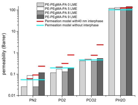 Permeability values for 25/50/25 wt % 0, 5, 8 and 9 LME PE/PEgMA/PA6 with serial model including interphase limits.