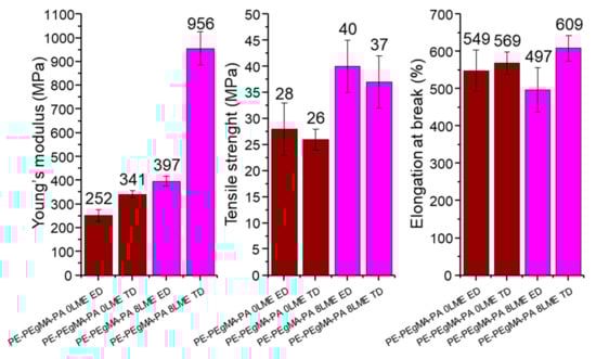 Mechanical properties in extrusion direction (ED) and transverse direction (TD) of PE/PEgMA/PA6 multilayer films extruded with 0LME (5 layers) and with 8LME (1029 layers).