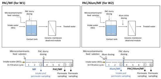 Scheme of powdered activated carbon/(coagulation)/microfiltration process, i.e., PAC/MF for intake water W1 and PAC/Alum/MF for intake water W2 (top) and of the respective spiking trials’ procedure (bottom) (8 × 1-h filtration cycles, being 3 cycles without PAC and 5 cycles with PAC dosing).