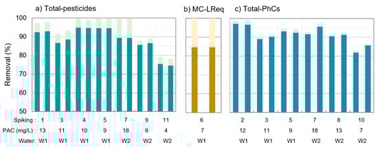 The removal of total-pesticides, microcystins (MC-LReq), and total-PhCs after PAC/(Alum)/MF is presented in Figure 2 (2 samples per spiking trial), where the total-pesticides and total-PhCs concentrations are given by summing the concentrations of all pesticides or PhCs analysed. When a compound’s concentration in the permeate water was below the limit of quantification (LOQ), the removal efficiency varied between the value considering for that contaminant its LOQ (darker colours) and the value considering 0 µg/L (lighter colours).
