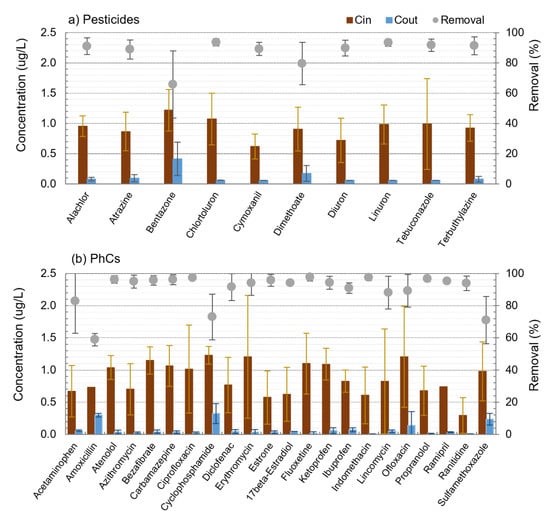 Overall, high removals were also observed for PhCs (Figure 3b), with 14 compounds out of 22 presenting minimum removal above 85% and 19 out of 22 with average removals also above that value. Similarly to pesticides, individual PhCs also presented different PAC adsorption behaviours. Some compounds had always removals ≥ 90%, the case of atenolol, azithromycin, bezafibrate, ciprofloxacin, estrone, beta-estradiol, fluoxetine, and propranolol, while others presented lower removal or higher removal variability between trials, namely acetaminophen (83 ± 20%), amoxicillin (59 ± 4%), cyclophosphamide (73 ± 14%), and sulfamethoxazole (71 ± 15%).