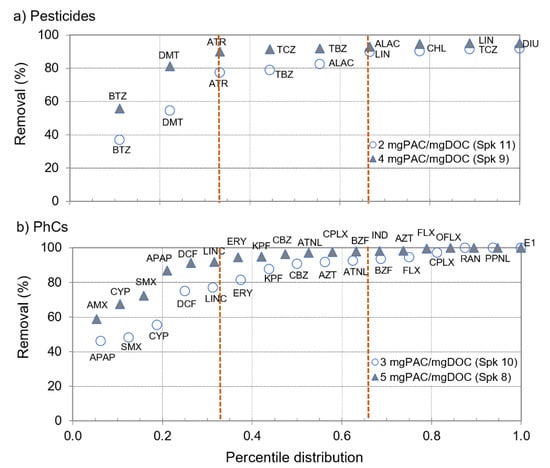 To analyse the microcontaminants’ amenability to PAC adsorption the percentile distribution of removal efficiencies of pesticides and PhCs during two spiking trials (those with the highest number of microcontaminants and the lowest PAC doses, i.e., spiking 9 and 11 for pesticides and spiking 8 and 10 for PhCs, Table 2) is represented in Figure 4. The compounds were then grouped in three percentile ranges for further analysis: P33 (less amenable); P34–P67; >P67 (more amenable).
