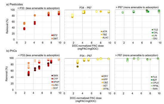 Removal as a function of DOC-normalized PAC dose for a pool of individual pesticides (a) and PhCs (b) presenting different amenabilities to PAC adsorption.