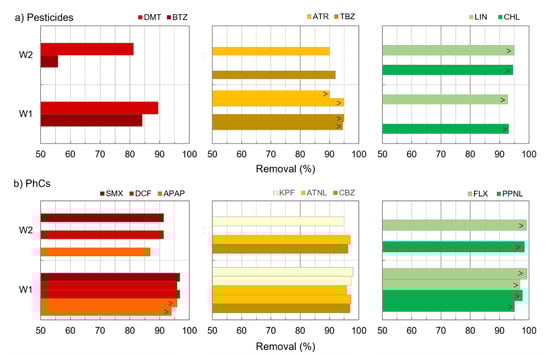 Removal of individual pesticides (a) and PhCs (b) presenting different amenabilities to PAC adsorption as a function of intake water, W1 or W2 (trials with similar PAC doses and different intake waters were compared; 8–11 mg/L PAC for pesticides and 11–13 mg/L PAC for PhCs; “>”for removals computed with LOQ).