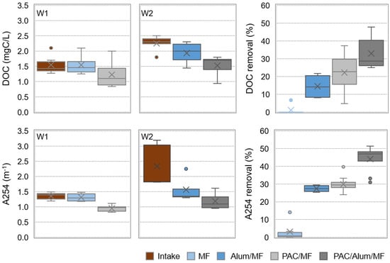 NOM content, as DOC and A254, in pilot intake (W1 or W2) and permeate waters after MF and PAC/MF (for W1, 7–13 mg/L PAC) or Alum/MF and PAC/Alum/MF (for W2, 2–3 mg/L Al2O3 and 4–13 mg/L PAC) and respective removals (box plots with maximum, P75, average, median, P25 and minimum values; little circles are outliers).