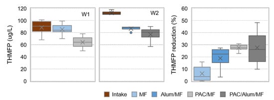 The DOC and A254 contents in pilot intake and in permeate water after MF and PAC/MF (for W1) or Alum/MF and PAC/Alum/MF (for W2) are depicted in Figure 7, as well as the respective removals. Box plots represent maximum, P75, average, median, P25 and minimum values. Similar box plots are also presented for trihalomethane formation potential (THMFP) in Figure 8.