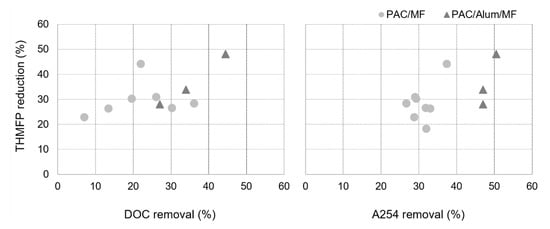 A good correlation was observed between A254 removal and THMFP reduction (R2 = 0.92) (Figure 9 right) and between DOC removal and THMFP reduction (R2 = 0.99) for PAC/Alum/MF (Figure 9 left), though not for PAC/MF. Coherently with our PAC/Alum/MF results, a recent study with data from 30 water treatment plants across Scotland over a 30-month period showed A254, DOC and DOC hydrophobic fraction to be good indicators of THMFP (R2 = 0.79–0.82) and haloacetic formation potential (R2 = 0.71–0.73) [51]. The higher A254 values in W2 (1.8–3.2 m−1 for W2 vs. 1.2–1.5 m−1 for W1, minimum–maximum values) also justify its significantly higher THMFP (p-value of 0.04), namely 111 µg/L in W2 vs. 91 µg/L in W1.