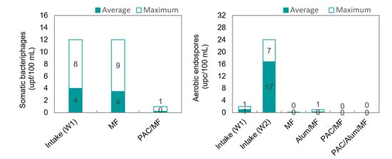 Bacteriophages, i.e., viruses that infect bacterial cells, are non-toxic and non-pathogenic for humans, animals, or plants, are reasonably similar to mammalian viral pathogens in size, shape, morphology, but are easier and less expensive to isolate and enumerate relative to enteric viruses, which explains their use as surrogates for pathogenic virus removal performance in several studies [18,24,52]. Generally, three bacteriophage groups, namely somatic coliphages, male-specific F-RNA phages and Bacteroides fragilis phages, are frequently used as surrogates for pathogenic viruses in environmental studies [52], and were monitored during trials. Positive results were only verified for somatic bacteriophages in W1 intake, meaning that only MF and PAC/MF could be assessed for their removal (Figure 10).