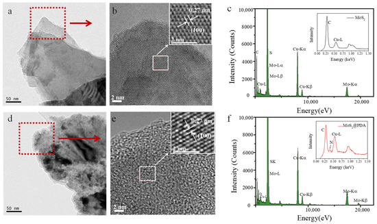 The morphology of MoS2 and MoS2@PDA was investigated by FETEM (Figure 2). It can be found that the surface of the MoS2 was smooth. After modification, MoS2@PDA showed many convex coatings in Figure 2d,e. Figure 2b,e show the HRTEM images of MoS2 and MoS2@PDA. It can be observed that the edge structure of MoS2@PDA becomes softened compared to the unmodified MoS2. In addition, the inset images revealed that both MoS2@PDA and MoS2 consist of the hexagonal lattices and the lattice spacing of 0.27 nm, which was corresponding to the (100) lattice plane MoS2 [27]. The energy dispersive spectroscopy (EDS) spectrum shown in Figure 2c,f indicated that a new peak N can be detected on MoS2@PDA.