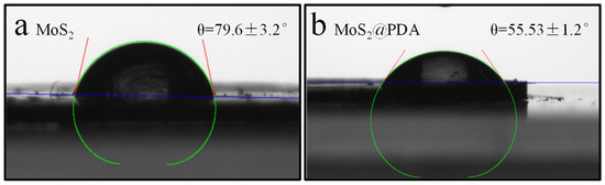 The surface hydrophilicity was characterized by the water contact angle (CA) analysis. Average values were obtained by measuring three different locations. As shown in Figure 3, the CA of pristine MoS2 was 79.6 ± 3.2°. Impressively, the CA of MoS2@PDA was 55.53 ± 1.2°, which indicated the improved water wettability of MoS2 by PDA coating. The major reason for this improvement was that dopamine contains a large number of hydrophilic amines and hydroxyl groups, which polymerize under alkaline conditions to form PDA and deposit around MoS2, enhancing the surface hydrophilicity and thus reducing the CA [28,29].