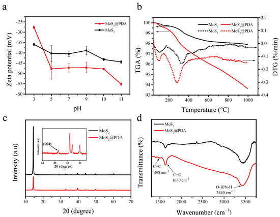 The zeta potential characteristic of particles was shown in Figure 4a. Due to the deposition of zwitterionic PDA, at low pH, the amino group of the PDA was protonated. When pH = 3, the potential of MoS2@PDA was −27.65 mV, and that of MoS2 was −35.9 mV. However, with the increase of pH, the potential of MoS2@PDA was lower than MoS2. This was due to the negative charge of the PDA phenol group after deprotonation at high pH, which enhanced the negative charge of modified particles [30].