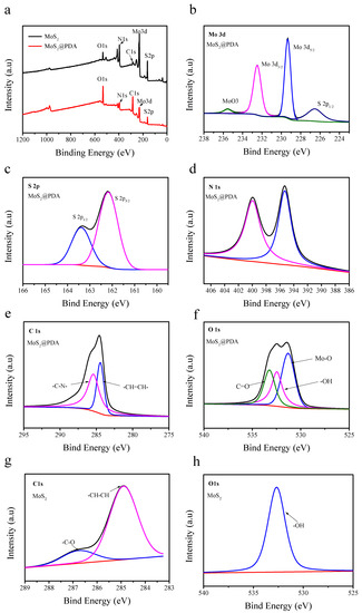 The chemical composition of MoS2@PDA was further investigated by XPS analysis. As shown in Figure 5a, the XPS full energy spectrum investigation indicated that Mo, S, C, N, and O elements were present in the hybrid. It was found that the MoS2 characteristic peaks, such as Mo 3d and S 2p, were reduced after the modification of dopamine. However, the intensity of O1s and C1s were enhanced, and we confirmed the production of dopamine-induced polymerization, which was coated on the MoS2 surface. The high-resolution Mo 3d spectra (Figure 5b) had three peaks; 229.34 eV and 232.51 eV related to Mo4+3d5/2 and Mo4+3d3/2, while the peak at 235.59 eV may be derived from the surface oxidation of Mo6+ [36,39]. In the spectra of the high-resolution S 2p (Figure 5c), there were peaks at 162 eV and 163.3 eV corresponding to the bivalent S 2p3/2 and S 2p1/2 (S2−) [40]. There were two peaks in N1 (Figure 5d); the one at 399.9 eV was associated with pyrrolic nitrogen in an indole ring, and the one at 395.3 eV related to the pyridinic resulting from the dopamine functionalization [41,42]. In the MoS2@PDA (Figure 5e), the binding energy of C1s at 284.5 eV was assigned to C–C/C–H bonds, while that at 285.7 eV was assigned to C–O/C–N, respectively [43]. In the original MoS2 (Figure 5g), C1s at 284.9 eV and 286.8 eV was related to C-C and C–O, which may derived from precursors left over from the formation of MoS2. In the analysis of the O 1s, by comparing Figure 5f,h, there were two new peaks in the modified MoS2 531.3 eV, corresponding to Mo–O and 533.23 eV related to the chemisorbed oxygen [44,45]. The binding energy 532.44 eV on MoS2 was related to O-bonding with residual water [46].