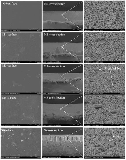 The surface and the cross-sectional morphologies of membranes are shown in Figure 6. With the increase of MoS2@PDA concentration, the influence of MoS2@PDA can be noticed. By adding MoS2@PDA, the surface was no longer as smooth as the pristine one. It was because during phase inversion, MoS2@PDA migrated from the PES matrix to a water bath and appeared on the membrane surface.