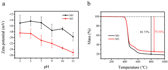 The surface charge of membranes is a critical factor to affect the filtration performance of membranes. As shown in Figure 8, the pristine M0 membrane showed negative charges ranging from 3 to 11 as the pH values increased. These negative charges were believed to come from the functional groups of PES (O=S=O) and PVP (O=C–N) [51]. After the introduction of MoS2@PDA, the M3 membrane showed more negative charges than that of the pristine membrane at different pH values, which was caused by the electronegativity of MoS2@PDA.