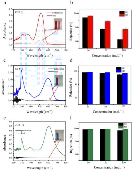 Dye removal experiments were conducted by using three kinds of dyes solution (C2B, RB4, and JGB) with different concentrations (10, 50, and 100 mgL−1). Figure 10 shows the retention performance of different dyes. Figure 10a,c,d shows the separation effect of M3 on 50 mgL−1 dye, displaying the UV-visible spectra of the dye solution before and after the filtration. The obvious difference of colors of the feed solution and permeate solution indicated the high dye rejection performance of the M3 membranes. Moreover, compared with the pristine M0 membrane, the M3 membrane showed better dye retention effects to those dyes. The RB4 and JGB selectivity performances of the M3 membrane were stable even when the dye concentration increased from 10 to 100 mgL−1. However, for the C2B solution, as the dye concentration increased, the membrane retention rate fell from 94.17% to 78.43%. This may be due to the increase of impurities with the increase of dye concentration. The addition of these ions enhanced electrostatic shielding, thus reducing the rejection of the dye [55].