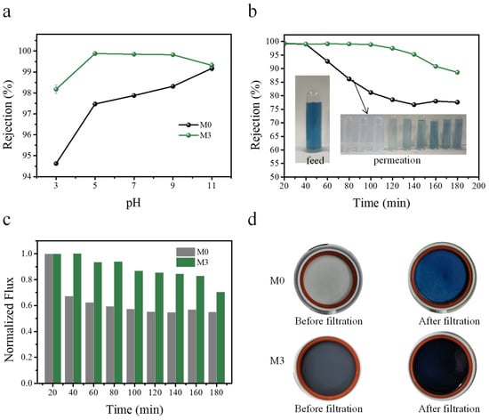 The zeta potential characterization of the membrane is shown in Figure 8a. With the increase of pH, the negative charge on the membrane surface was enhanced, and the zeta potential of the M3 membrane was always lower than that of the M0 membrane. The lower zeta potential for the M3 membrane was more conducive to the adsorption of positively charged dye JGB. Due to the concentration polarization on the membrane surface, the dye retention rate would increase with the increase of pH (Figure 11a) [56]. The membrane’s interception rate of JGB decreased with the extension of filtration time in a longer period of filtration (Figure 11b). As the separation time was extended to 180 min, the JGB rejection of the M3 membrane was 88.61%, while the JGB rejection of the M0 membrane fell to 77.59%, indicating the good stability of the M3 membrane. Figure 11c shows the water flux of the M0 and M3 membranes during the long filtration test. Compared to the M0 membrane, the M3 membrane showed a low water flux reduction rate, which further confirmed the stable dye filtration performance of the M3 membrane. In future work, we will select more types of pollutants with different sizes and involve membrane cleaning cycles to investigate the stability and the service life of the membrane.