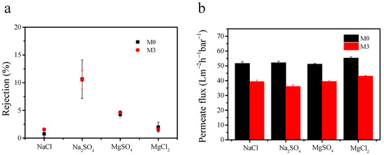 The high salinity in the textile wastewater affects the retention of dyes by the membrane. Passing the salt through the membrane is a possible strategy to separate dye and salt in one step. This will save costs for subsequent recovery of dye and salt [57]. The filtration performance of the pristine membrane and MoS2@PDA-modified membrane was further evaluated with different salts (shown in Figure 12). As expected, the rejection of salts was inefficient, showing 0.76%, 10.64%, 4.31%, and 1.99% for NaCl, Na2SO4, MgSO4, and MgCl2, respectively. Accordingly, because M0 and M3 were negatively charged, the low salt rejection could be ascribed to the membrane screening effect. The hydration radius of salt ions was much smaller than the membrane pore size (Na+: 0.36 nm, Mg2+: 0.43 nm, SO42−: 0.38 nm, Cl−: 0.33 nm) [58]. The small-sized ions could be allowed to pass through the membrane pores easily [59].