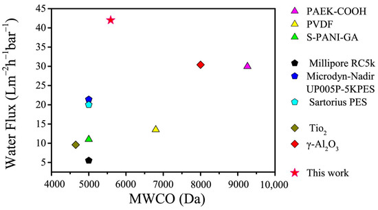 The TUF membranes with similar MWCO are listed. Water flux of non-commercial polymer TUF membranes in the literature [60,61,62], commercial TUF membranes reported in the literature [63,64], ceramic TUF membranes reported in the literature [65,66] and a MoS2@PDA/PES mixed matrix TUF membrane in this work are compared.