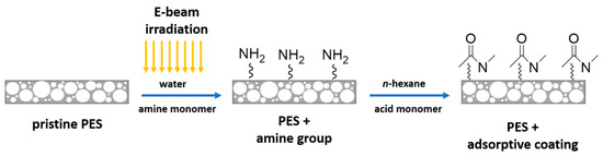 In this work, we report a novel and efficient method to prepare an adsorber membrane by creating an amide functional coating on porous microfiltration (0.45 µm) PES membrane surface using the concept of interfacial polymerization reaction [43]. The porous support membrane provides the mechanical stability required for operating under high permeation rates. The amide coating was fabricated by means of interfacial reaction between hexamethylene diamine (HMD) or piperazine (PIP) as the amine monomer and trimesoyl chloride (TMC) or adipoyl chloride (ADC) as the acid monomer on the surface of the PES membrane. Electron beam (EB) irradiation was used to immobilize the amine monomers on the surface of the PES membrane via a grafting-to reaction. A subsequent reaction with an acid monomer resulted in the amide coating.