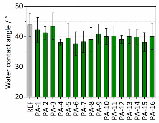Water contact angle (WCA) analysis was performed to investigate the surface wettability of the polymer membranes. The water contact angle values for the different modifications and the untreated PES (referred to as REF) membrane are presented in Figure 2. The untreated PES membrane exhibits a hydrophilic surface with a water contact angle of 44°. The modification with the thin PA coating resulted in a moderate decrease of the water contact angles in the range of 37–43°. The lowest water contact angle was observed after modification with PIP and TMC and adding toluene (PA-4). The decrease in the contact angles reveals the enhancement of the wettability of the PES membrane after modification. The reason for this finding could be attributed to increased hydrophilicity due to the presence of hydrophilic amide units in the coating. It is assumed that the decrease in the contact angles discloses the successful formation of the thin amide coating on the surface of the PES membrane. Figure S1 in Supplementary Information shows the experiment for determining the surface wettability of PA-4. The effect of toluene on wettability was also investigated. No significant effect of adding toluene on the wettability of the untreated PES membrane was observed. The water contact angles are listed in Table S1.