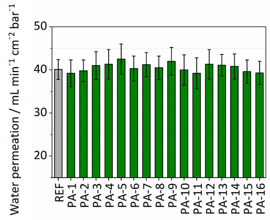 Membrane performance in terms of permeance was determined by measuring the pure water permeability. The permeance values for the untreated PES membrane and the different modifications are summarized in Figure 3. The untreated PES membrane is already hydrophilic and has a permeance value of 40.1 mL∙min−1∙cm−2∙bar−1. All the PA modifications showed a slight increase in performance with an average permeance value of 41 mL∙min−1∙cm−2∙bar−1. PA-5 with modification parameters of PIP-ADC-150 kGy and without the addition of toluene showed the highest enhancement in permeance with a value of 42.5 mL∙min−1∙cm−2∙bar−1. The slight increase in water permeability can be attributed to the enhanced wettability of the membrane surface. It is assumed that the enhanced wettability of the surface results in the formation of a thin water film on the top of the polymer membrane. This water film helps to prevent hydrophobic interactions and can increase water permeability. Khorshidi et al. [45] reported an average water flux of 7–68 L∙m−2∙h−1 at a trans-membrane pressure of 1.52 MPa (equivalent to 0.001–0.01 mL∙min−1∙cm−2∙bar−1) for thin-film composite polyamide coated on PES (0.2 µm) microfiltration membrane. A comparison between the permeance values obtained here with what was reported by Khorshidi et al. discloses that immobilizing the amine component by electron beam and the subsequent reaction with the acid reagent could be a better approach to maintain the high water permeability of the PES support. The values from water permeance experiments are presented in Table S2.