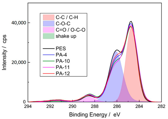 The application of the thin amide layer changed the composition measured at the membrane surface, and a significant increase in nitrogen on the surface of the membrane was detected. Since the reference PES membrane does not contain any nitrogen, this effect indicates that amide functionalities were formed on the membrane surface, i.e., the modification was successful. The formation of the amide coating can be further proved by the C1s spectra (Figure 5). Three signals were observed for the reference and modified PES membranes: a major peak at 285 eV that corresponds to carbon atom without adjacent electron-withdrawing atoms (C−C and C−H), an intermediate peak at 286.5 eV which is assignable to a carbon in weak electron-withdrawing atoms (C−O−C), and a minor peak at 288.5 eV which is associated with carbons attached to strong electron-withdrawing atoms (carboxylic O=C−O and amides O=C−N) [46].