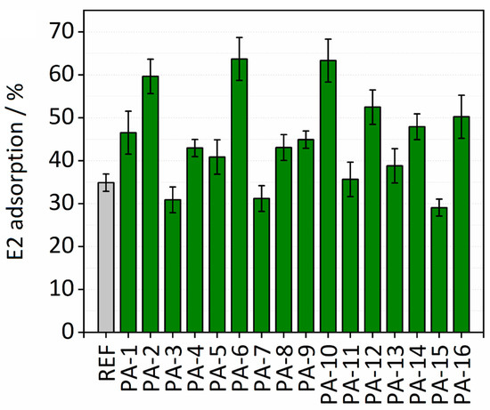 Various methods such as catalytic degradation, photocatalytic degradation, biodegradation, advanced oxidation, liquid–liquid extraction (LLE), and ozone reactive LLE have been explored for the removal of estrogenic EDCs from water [15,16,17,18,19,20,21]. In comparison to the mentioned techniques, adsorption was addressed as a more efficient and effective method. In fact, adsorption is an environmentally friendly method that is at the same time efficient and easily accessible. Various adsorbents, e.g., granular activated carbon, chitin, chitosan, ion exchange resin, and carbon-based adsorbents made of industrial and agricultural waste are able to remove E2 from wastewater [22]. Yoon et al. [23] have applied different kinds of powder activated carbon for the removal of E2. Tagliavini et al. [24] studied the adsorption of steroid micropollutants on polymer-based spherical activated carbons. Other sorbents including single-walled carbon nanotubes and multi-walled carbon nanotubes have also shown good performance to remove E2 from aqueous systems [25,26,27,28]. However, high production and regeneration costs make these methods inefficient in water treatment and purification processes. It is, therefore, apparent that new adsorbents for removing estrogenic EDCs from water are necessitated.