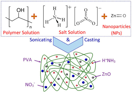 Series films of proton-conducting PVA/NH4NO3/ZnO NSPEs with different ZnO-NP contents were prepared by the casting method. Referring to our previous works, the SPE based on PVA incorporated with 30 wt.% NH4NO3 exhibited the highest room-temperature ionic conductivity [22,23]. In this study, the SPE solution was prepared by dissolving 2 g of PVA in 40 mL of double-distilled water and heating for 60 min at 90 °C. The PVA solution was cool at ambient temperature, and then 30 wt.% NH4NO3 (0.857 g) dissolved separately in 5 mL was added to the viscous polymer solution, with continuous stirring for a further 45 min to ensure the intimate mixing. Later, different weight percentages of ZnO-NPs (1 to 5 wt.%) with particle sizes of 10–70 nm were added to the previous solution, and the mixtures were sonicated for 30 min to achieve homogeneous dispersion of NPs. The homogeneous solutions were then poured into various clean Petri dishes and left to dry in the air under ambient conditions for a two-week period for the membranes to form. After air-drying, the samples were stored in a desiccator with silica gel to ensure that the films were completely dried prior to subsequent experimentation and characterizations. The nanocomposite solid polymer electrolyte (NSPE) membranes were coded as NSPE-0, NSPE-1, NSPE-2, NSPE-3, NSPE-4, and NSPE-5, for a proton-conducting PVA/NH4NO3 polymer electrolyte, loaded with 0, 1, 2, 3, 4, and 5 wt.% of ZnO-NPs, respectively. The scheme for sample preparation is depicted in Figure 1.