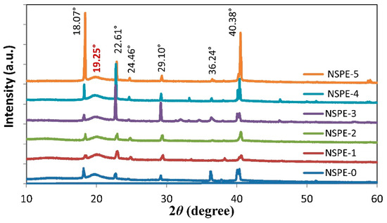 The XRD patterns for PVA/NH4NO3/ZnO NSPEs with varying ZnO-NP contents are shown in Figure 2. The XRD patterns for all samples exhibit a broad peak centered at 2θ = 19.25°, corresponding to the semi-crystalline nature of PVA that arises from the intra- and inter-molecular hydrogen bonding of the O–H groups in the PVA backbone [24]. However, the presence of NH4NO3 crystalline peaks in all samples at 18.07°, 22.61°, 24.46°, 29.10°, 36.24°, and 40.38° indicates the presence of some undissociated NH4NO3 salt in the NSPE samples [25].