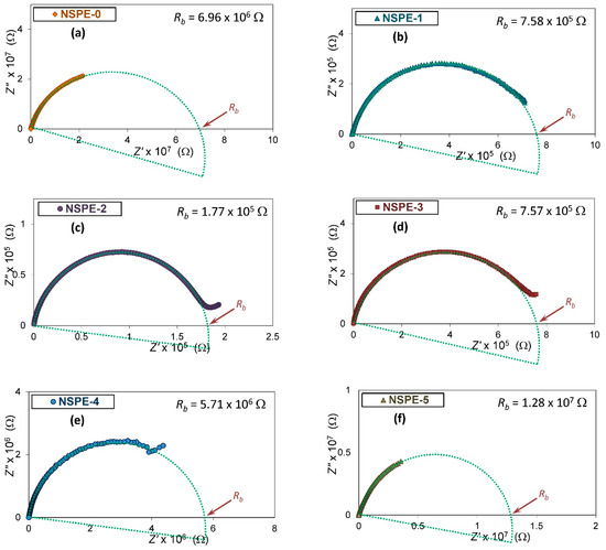 Impedance plots of PVA/NH4NO3 polymer electrolyte samples containing 0 wt.% (a); 1 wt.% (b); 2 wt.% (c); 3 wt.% (d); 4 wt.% (e); and 5 wt.% (f) of ZnO-NPs at room temperature.