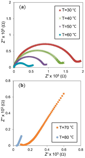 Impedance plot of the NSPE-2 sample at temperatures of 30–60 °C (a) and 70–80 °C (b).