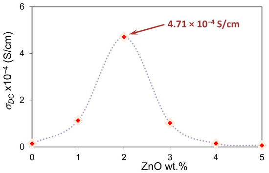 The variation in room-temperature direct current (DC) conductivity () versus ZnO-NP content is presented in Figure 6. The dependence of on ZnO content provides information on the particular interaction between ions of NH4NO3 salt and the functional group of the PVA matrix. Kadir et al. [32] reported that the chitosan-PVA–NH4NO3 proton-conducting system gives the optimum value of ionic conductivity 2.07 × 10−5 S/cm at room temperature upon incorporating 40 wt.% salt, which is comparable with the undoped SPE sample in the present work. The peak observed in Figure 6 depicts the room-temperature highest DC conductivity optimized at 4.71 × 10−4 S/cm with the addition of 2 wt.% of ZnO-NPs. Beyond that, the ionic conductivity decreases quickly. Tripathi and Kumar [33] attributed the decrease in conductivity with increasing ZnO concentration beyond 3 wt.% in plasticized polymer gel electrolytes based on poly(vinylidene fluoride)-co-hexafluoropropylene (PVDF-HFP) to the small value of ZnO-NPs′ dielectric constant compared to the polymer gel electrolyte system.