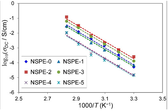 Temperature-dependent direct current (DC) conductivity for PVA/NH4NO3/ZnO NSPEs.
