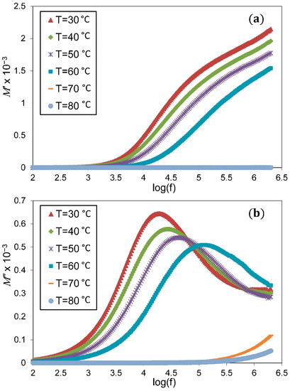 The variations of real () and imaginary () parts of electric modulus for the PVA/NH4NO3 doped 2 wt.% ZnO at various temperatures are introduced in Figure 8. The plot of and shows low value at lower frequencies, which is caused by the huge value of interfacial capacitance correlated with the electrode-electrolyte boundary [34]. However, no definitive peaks can be observed for the plot, and the spectrum shows an asymmetry relaxation peak accompanied by the dispersion of in the frequency range employed in this study. The broadness and asymmetry shape of the peak disclose the distribution of relaxation time and non-Debye relaxation process [14,45].